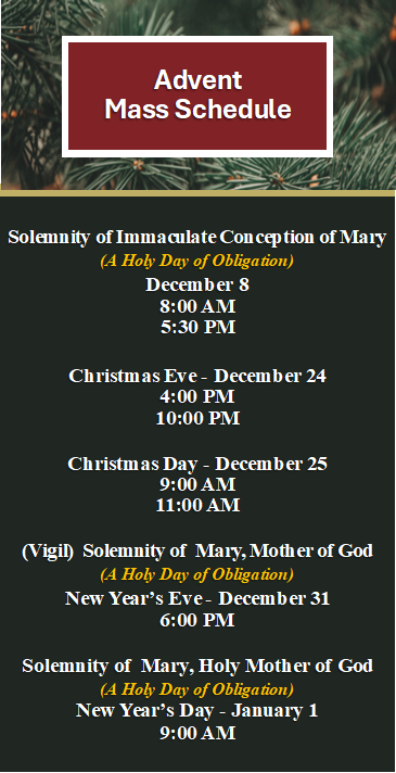 Tuesday: 6:00 PM Followed by Eucharistic Adoration & Confession